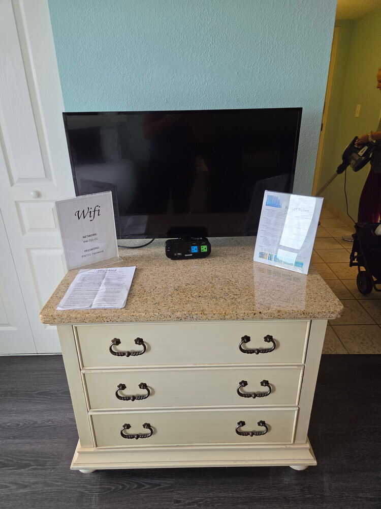 CONDO This one room condo is located in Tower 3 on the quiet seventh floor. The condo sleeps 4. It has a king bed in the bedroom area and a new futon sleeper sofa in the living area complete with sanitized linens that are freshly made up for you. The Beach Condo has a new smart TV with premium stations, free Wi-Fi and board games. The remodeled kitchen has a microwave, full fridge, electric griddle, crock pot, Keurig coffee maker, toaster oven, double electric burner, blender and eating utensils. Also included is a hair dryer, iron, sunscreen, boogie boards, beach chairs and noodles. It is so well stocked that you do not even need a toothbrush.